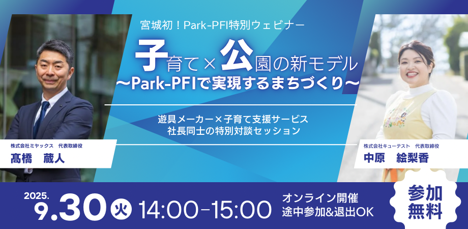 株式会社キューテスト(本社:仙台市、代表取締役:中原絵梨香、以下「キューテスト」)は、株式会社ミヤックス(本社:多賀城市、代表取締役社長:髙橋蔵人)が主催するオンラインイベント「ミヤックスセミナーvol.1 子育て×公園の新モデル〜宮城県初 Park-PFIで実現するまちづくり〜」(開催日:2025年9月30日)を企画・運営しております。